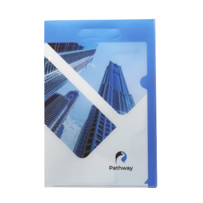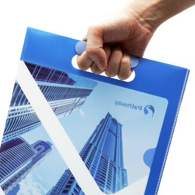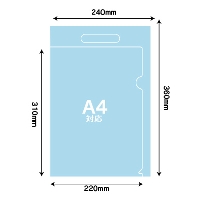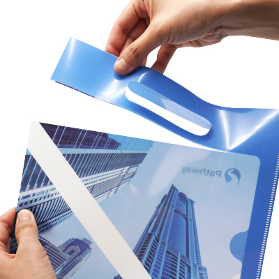 ミシン目に沿って切り離すことで、スタンダードタイプのクリアファイルとして使用出来ます。取っ手の切り込みも入っているので持ち運びに便利で、展示会やオープンキャンパスなど様々なイベントに大活躍です。近年よく見かけるクリアファイルの新定番です。